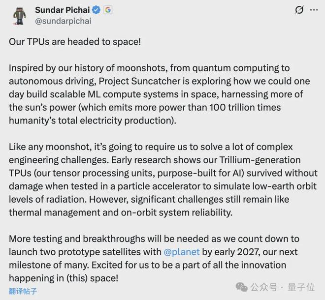 来自奥飞斯量子比特的 Cressy |公众号Qbitai nvidia与Google竞相上天!搭载 NVIDIA H100 的卫星本月被送入太空,谷歌也不甘落后——CEO 皮查伊表示 TPU 也将发射,首批两颗卫星将于 2027 年初落座。未来,两家公司都计划在太空建设吉瓦级数据中心。网友表示,在太空部署算力的想法真的很酷。不过,这条赛道上的领头羊并不是英伟达或谷歌,而是一家来自中国的公司,该公司早前就已经开始了太空算力的布局。 AI芯片即将上天堂。英伟达芯片要上天了,主要是星云这家初创公司的启动计划所消耗的。本月全面发射的星云一号卫星带来了H100,它重60公斤,大小与小冰箱差不多。选择NVIDIA芯片的原因是StarCloud需要具备性能与地球上的数据中心相当,NVIDIA GPU 在训练、微调和推理方面拥有最佳性能。 StarCloud-1将从合成孔径雷达(SAR)卫星星座接收数据,在太空中实时处理数据并将其发送回地球。同时,StarCloud也是谷歌“毕业生”的初创云AI加速器项目。它计划利用H100在轨道上运行谷歌的开源gemma,证明在太空运行大规模语言模型的可行性。 StarCloud 将于明年初推出商业服务,随后计划在 Blackwell 推出 espassion。最终目标是建设一个功率为5吉瓦、跨度约2.5英里(约4公里)的轨道数据中心。 CEO Philip Johnston还预测,10年内,所有新的数据中心都将建在太空中。谷歌从小规模起步,计划将自己的 TPU 送入太空。两颗原型卫星预计将于 2027 年初发射。谷歌将该计划命名为“Project Suncatcher”。原因是计算星座中的卫星全部由太阳能供电,它们之间的通信链路也将通过自由空间光通信来实现。前两颗原型卫星将测试谷歌TPU在太空中的实际运行情况,验证光通信链路,并探索该机器执行分布式计算任务的可行性。从长远来看,谷歌的最终目标是在太空建立千兆瓦级数据中心。太空扩张的优势与挑战两家公司都展示了在太空部署计算设施的优势,谷歌也专门为此发表了一篇论文。首先是成本优势。 StarCloud提供的数字认为,即使算上发射成本,太空能源的成本也仅为地面解决方案的1/10。谷歌在这里提供了更精确的计算。假设Leo的发射成本降至每公斤200美元,卫星平均年功率单位可降至每千瓦年810美元,相当于目前美国数据中心成本范围570美元至3000美元。并且palaunch的成本呈现下降趋势。以SpaceX为例,历史数据显示,其年发射负载能力翻了一番,单价下降了20%。如果维持这条曲线,预计到2035年每公斤发射成本可降至200美元以下。当马斯克的星舰重复使用时,发射成本有望降至每公斤60美元甚至15美元,并且成本持续加速下降。成本低廉的一个重要原因是电力更容易获得——谷歌的一篇论文显示,太阳能的发电量超过了人类发电总量的100万亿倍。在合适的轨道上,太阳能电池板的效率可以是地球上的 8 倍,并且可以几乎连续发电,从而减少对电池的需求。接下来是散热。与地球上许多依靠蒸发塔和淡水进行冷却的数据中心不同,StarCloud数据中心可以利用深空的真空作为无限散热器。英伟达和星云联合开发了隔热架构,通过卫星外壳的高导热材料将H100的热量传导到表面,然后以红外辐射的形式释放到太空。另外,还有在轨卫星数据处理——如果将其他卫星产生的数据传回地球进行计算,会消耗大量的通信资源。天基卫星可以在轨道上完成计算,只需将计算结果回移,从而减少通信压力。星云对SAR卫星数据的处理就是在这条道路上的一次尝试。谷歌更多验证的一边。例如,对于通信链路,现成的DWDM模块(如400G PM-16QAM光模块)已在实验中成功实现800Gbps单向(1.6Tbps双向)短距离光通信,证明此类模块可以用于小规模卫星集群。还有大型卫星的控制。谷歌的模型表明,适度的轨道机动对于维持星座的稳定运行是必要的。 TPU还具有抗辐射能力。谷歌表示,即使是敏感的 HBM 组件,在累积剂量达到 2000RAD(SI) 后也会开始出现异常,这几乎是预期五年任务剂量的三倍。所以总的来说,天基机器学习计算的基本概念不受基本物理定律或不可估量的经济约束的约束,但仍然存在许多重大的工程挑战,例如热管理、高带宽地面通信和在轨系统的可靠性。国产算力卫星已投入常规商用。 StarCloud 刚刚将 H100 发射升空。谷歌的 TPU 等待了一年多才进入该领域。然而,距离我国首个空间算力星座发射已经过去了快半年的时间。今年5月,浙江实验室“三体计算星座”首批12颗卫星送入预定轨道。每一颗兰班达旺计算卫星都具备空间计算和空间互联的能力,还配备了浙江实验室,负责赛斯伯恩智能计算机、天基模型等空间计算软硬件的开发,实现了“算力在天、在轨组网、模型在天”。与传统卫星相比,计算卫星将单颗卫星的计算能力从T级提升到P级。钍第一星座在轨计算能力达到5Pops,大幅提升单星高性能空间计算能力。这些卫星还可以形成类似“互联网”的互连。卫星之间采用激光通信,通信速度可达100Gbps。而今年9月份,Constellation实现了正常商业运营。如今,有了NVIDIA和谷歌的加入,这场Space AI的竞赛变得更加精彩。 [1] https://blogs.nvidia.com/blog/starcloud/?linkId=100000388085273