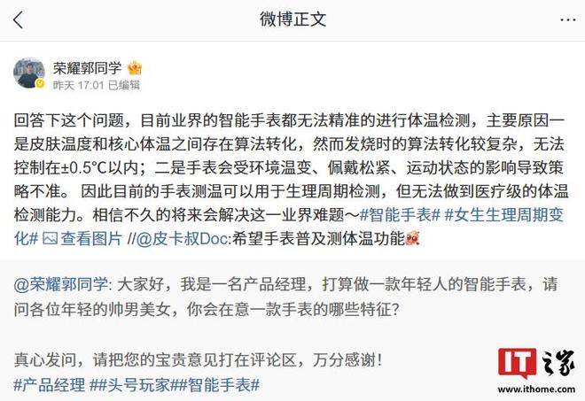 IT之家12月4日报道,荣耀全场景产品经理@GloryGuo此前曾透露,计划打造一款面向年轻人的智能手表,正在征求网友的相关意见。博主@pick Doc叔叔提出:“希望手表能够普及测量体温的功能。”他回答了这个问题:要回答这个问题,目前行业内的智能手表还无法准确检测体温。主要原因是主体的皮肤温度和体温之间存在转换算法。但发热时的转换算法比较复杂,无法控制在±0.5℃以内;其次,手表会受到环境温度、佩戴松紧度、运动状态等变化的影响,导致不适应策略。因此,目前手表的体温测量可以用于月经周期的检测,但无法实现检测能力身体的体温。相信行业内的这个问题不久的将来就会得到解决~博主@pica Doc叔叔继续传递自己的意见,表示已经有朋友在前几代手表中支持了这个功能,而且功能好玩又有意义。追踪数据可在手表上提示,仅供参考。荣耀全场景产品经理@荣耀郭同学表示:“是的,你要做一个综合的选择。”参考IT之家此前报道,目前支持体温检测功能(手腕温度/体表温度)的智能手表包括华为Watch 3/4/5/gt 3/gt 4/gt 5/gt 6/极致非凡探索/极致设计非凡大师/d/d2等系列,以及ultra/ultra/ultra 2/ultra 3、sams等。 Galaxy Watch 5/6/7/8 / Ultra等