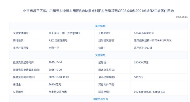On September 25, the old village of the Old Village of the Old Village of the Zhongtan Village Group, Hecun, Dongxiaokou Town, Changping District, CP02-0405-0001, was officially listed, with a starting price of 2.809 billion yuan and auctioned on October 30. About 31,342.64 meters, the scale control scale is ≤87,759.412 square meters, the starting price is 280.9亿元人民币,起价约为32,000元/双层仪表。地块面积的比率为2.8,高度极限为60米。所有R2 II类住宅用地和500平方米的社区管理服务均需要住房。该剧情位于丁格(Dinglu)的前Dongxiaokou部分,靠近以前的流行项目Aohai Mingyue和Aosos。业务包括Xisanqi Wanxianghaui,Yibu Haidian,位置很棒。作为卡拉达根(Karadagan),地块周围有许多土地提供土地。除住宅建筑外,它还包括公园绿色空间,基本教育,行业等,除了住宅住宅外,三个地块的0405街区组还位于总计559,200平方米。最值得注意的是该地块南部的12年教育土地,以及旁边113,400平方米的工业土地。这意味着该地区将是一个高端生态居民区,其中包括教育,其自身行业,并被包括在Aobei Forest Park的10,000公顷周围。 Changping正在积极组织和引入该地块南部街道的十二年教育地,目前被确认为北京第101号中学。这样,在第四代房屋的祝福中,该行业的“好住房”特征将有所改善。该清单的开始时间和包裹包裹的销售从2025年9月25日晚上9点开始,竞标截止日期为2025年10月29日,开始时间为17:00f竞标是2025年10月16日的9:00,秃头的截止日期为2025年10月15:00。Leju Beijing将继续关注您的土地趋势。